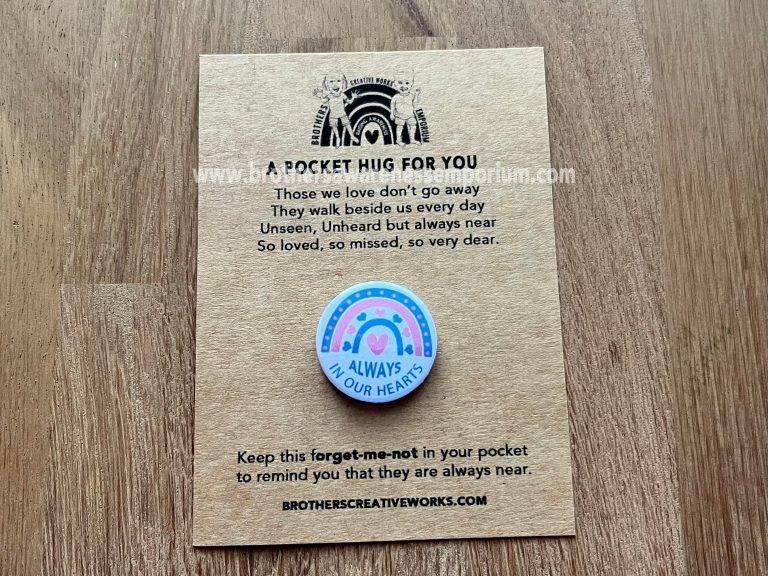 Pocket Hug – Just a little token to give or send to a friend or loved one to let them know you are thinking of them. They are also great for kids for first day’s back at school or going on camps or overnight trips. A pocket hug can be tucked into your pocket so you have a constant close by reminder that you are loved.